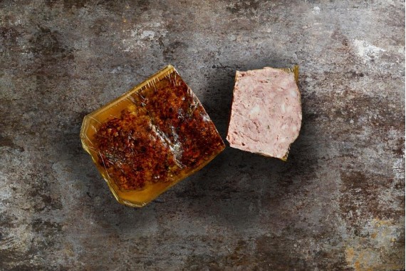 Décor : coiffe de porc, sucre caramélisé, gelée (eau, gélatine bovine et porcine, sel, dextrose, épices et gélifiant E407)