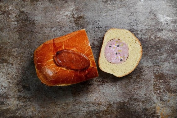 Composition : brioche patissière (farine, sel, levure, oeufs, crème liquide), saucisson à cuire (viande de porc française, sel, muscade, ail, vin rouge, boyau naturel de boeuf, pistaches)